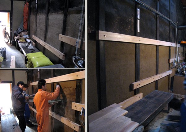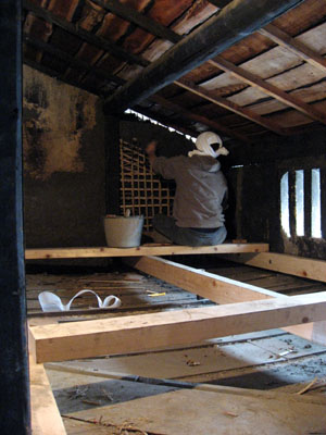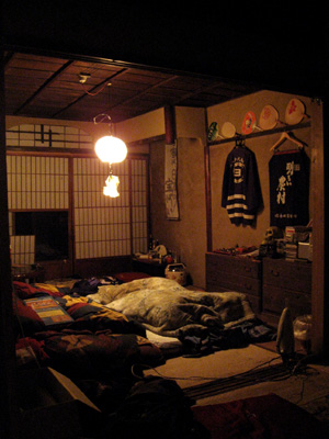 こないだも、町子さんの現在の現場・N邸の荷物整理のお手伝いに行ってきました。 N邸は、昔、御茶屋さん?(舞妓さんらがお客さんを相手する遊び屋?)だったらしく、いくつか部屋があるのですが各部屋に床があったり、意匠もいろいろと細かい細工があり、おもしろい町家でした。 さて、今回の作業。 屋根裏の荷物を整理したいということだったんですが、 出るは出るは・・・ 何セットもの食器・何セットもの鍋・たくさんの扇風機・布団・タンス・机・椅子・・・ みんなで流れ作業です。次から次に・・・ いらないものは貰って行ってイイとのことだったので、中身はどんなものか確認しては何か大宮でつかえるものはないかと目を光らせます。 おおっ、高そうなものが出てきたぞ!!! ・・・高いものはいりません。大宮には似合いません。 前行った町家のお手伝いでも・・・ もっと大きいコタツもあるよ~。そのコタツぢゃ小さいでしょ~。 ・・・いや、これでいいんです。大宮にはこれが似合うんです。 ここで、町子作のお絵かきを・・・ 大宮町家生活を妄想しながらの作品です。ささっと書かれた絵ですが、幸せな生活が詰まってます。 みなさんも、ここで暮らすJ&Yを妄想してみてくださいな♪まあ、自分が暮らしてるのでも楽しいかもね。けど、J&Yが暮らすとこに遊びに来た感じも妄想してみてはいよ♪ 僕らはこれから大宮町家に住むんです。 大宮町家にあったものを大宮町家に置いて、背伸びせず、大宮町家に合った、僕らに合った生活をするんです。質素でいいし、質素がいいし。大宮町家に置くものは、大宮町家より出しゃばっちゃいけない。大宮町家の僕らが塗った土壁・僕らが立てた柱・僕らが張った床が何より大切で、何よりも大宮町家生活を幸せにするものや・・・ああ、この壁崩す時大変やったな~。この壁塗ったのはYか~。この柱、Oちゃん頑張りよったな~。この鴨居はMの作品や~。この床・・・町子さん、さすがやな~。俺は土壁で隠れてるけど忘れちゃいけない竹木舞♪ってなふうに・・・ これからの作業でも、大宮町家に住んでからも、こんな幸せなとこを増やしていけばいい! 何を言いたいのか分からなくなってきた・・・ けどまあ、今日も大宮町家での生活を妄想で十分楽しんだ♪幸せや・・・ ・・・本日まとまらずおわり・・・ J 2007/11/29(Thu) 00:36:31