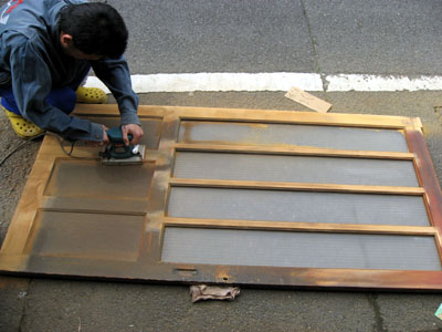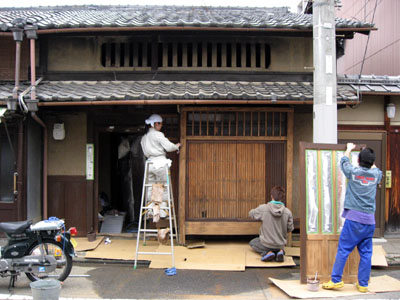 ぐっすり寝てしまい、外のご近所さんのにぎやかな話し声で起床・・・。「きれいになったね~」「ありがとうございま~す!」 さあ、今日も作業開始や! 昨日の残った部分のペーパーがけ。ドアもやっちゃおう! わ~い、きれいになった~♪♪ よし、早速べんがらを塗る準備や~♪ はるばる東京から観光のついでに作業に参加してくださるというM夫妻も集合して、まずは木の表面についた粉を拭き、ガラスやインターホンなどべんがらが付いたら困るところを養生テープでカバーしておきます! 「非行防止は家庭から」ももちろんしっかりカバー♪ 作業しているとご近所の方々がよく「きれいになったね~」と声をかけてくださり、その度に嬉しくなります。これからべんがら塗ったらもっともっときれいになりますよ~! 薄めた柿渋で溶いて、ハケ塗って、布で拭き延ばします。柿渋独特のキョーレツなにおいがします。 作業中、前を通った小学生達が、「この家、くさ~!」 ・・・ひどい・・・そんな言わなくてもいいじゃない・・・(T_T) 塗り終わると・・・う~ん、まるでお茶の家元の家のような雰囲気や♪(家元の方、ごめんなさい) さぁ、雨が降らないうちに仕上げの油ぶきもやっちゃうよ~!油でふくと、色が濡れたように深くなり、べんがらをコーティングしてくれます。 今回使ったのはよく使うエゴマ油ではなく、桐油。なんか塗ってたら香ばし~い油のにおいがして、おなかいっぱいに・・・。忘れずにドアも塗り、重厚感が増しました?? 久しぶりにISさんも大宮を見に来てくれました。たいやきの差し入れ、どうもありがとうございます~♪♪ 日暮れの大宮…どうですかね~?? なんか大宮じゃないみたいや・・・。きれいになってしまって、少し大宮らしさが無くなったようでさみしくもあり… これから家に帰る時「おっ」って思って嬉しいんかなぁ~。来てくださった皆さん、ご近所さん、ありがとうございました~! Y&J&町子&M夫妻&IS&大家さん&ご近所さんたち PR 2008/03/27(Thu) 16:55:02