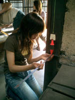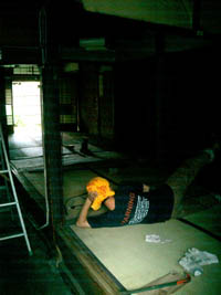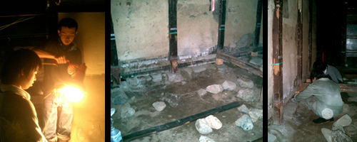 床下を開けて、屋根裏に入り、かる~い衛生掃除! 昔は、各地区で一斉に衛生掃除というものが行われていたらしい。畳を上げ、床下を開け・・・家の大掃除を行うのです。そして、昔は各家に出入りの大工がいて、その時に家の点検を行うんですね。しかも地区で一斉にですよ!もうお祭りなんでしょうな~・・・今では考えられないですね・・・寂しい世の中ですね・・・各家の前の道には、たくさんの畳が並んでいたそうです。不思議で、けど何か楽しい良い風景だったんだろうな~。見てみたい!とても見たい!! この日、町家見学に来られてたおじさん方も、床下開けているのを見て、昔の衛生掃除を思い出し、懐かしそうに色々話されていました。いろいろと考えさせられました・・・衛生掃除、復活せんかな。復活させたいな。何か出来ることはないかな・・・ 町家に住む大先輩方と情報交換・知恵を色々と聞き、とても勉強になりました。 見学が終わり、帰り際・・・ J 「姉町子さん、大宮町家の壁塗り来て下さいよ~。」 姉町子「今は忙しくて行けないけど、そのうち来るから、私が来るまでに荒壁塗りはやっときい! 仕上げは私がやっちゃるけん!」大げさに書きましたが・・・ ・・・・・・・・・・・・・・・・・・・・・・・・・姉町子さん、かっちょいい~~~~~!!!!! その後、町子(妹)は走る!ひたすら走る!顔が青ざめてきたが走る・・・雨の中、走る・・・ そうして、大宮町家へ着き、町子(妹)&J&Yの3人で石並べの続きをやりました。 まずは、もう夕暮れで暗かったので用意した現場用ライトを設置。明るい♪うぃ~♪ そして、そのライトをYが軽やかに落とし、割り、石を並べます・・・くら~い♪うぃ~~~♪ そんなこんなもありましたが、こないだと同じように奇跡の配合セメントで固めつつ石を並べます。 作業中、大家さんの奥様がよくジュースを持ってきて下さいます。 J、心の中で思う・・・『おっ、今日は奥さん、チューハイぢゃないぞ!!?』・・・(わけあり。おいおい暴露していきますよ、奥様♪笑) 本日の作業を終え、大家さんに貰ったジュースを3人で一気のみ競争したとさ・・・Jが1番だったとさ・・・ 町子&J&Y、今日もよく頑張った!!!お好み焼きを食べたとさ・・・どっかり来たとさ・・・ちゃんちゃん。 大家さん奥様&姉町子&町子&J&Y&市役所の方々&町家に住む方々&IW&夜間の方々&M 2007/09/10(Mon) 22:48:58