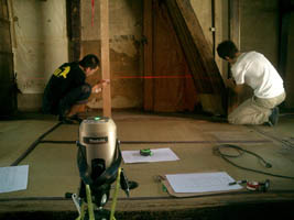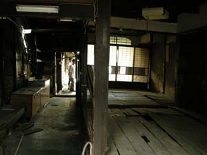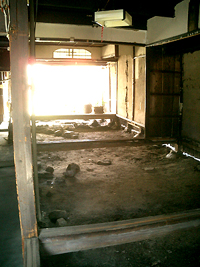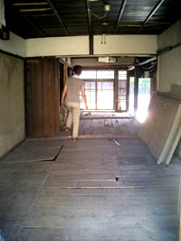 表を見つめ、横面を見つめ、裏面を見つめ・・・中に入り、柱を見つめ・・・ 僕らにはまだどう直していくのか、はっきりは分からないけども、K棟梁には見えているのでしょう。 S先生&K棟梁の指示により、今後の作業が決まりました。 これから、まずは建具を外し、レーザー機器で水平・垂直をとり、床の下がり&柱の傾きをとります。 建具を全て外すと、部屋の中は広々と! 俺も銭湯に行かねば!! 動物園!!!がんばれな!!!!! S先生&K棟梁&町子&J&M 2007/07/21(Sat) 21:04:55