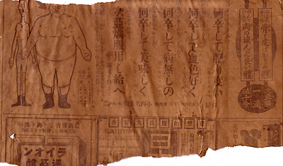 そのためか、あるいは昔の人々が節約をしていたからか、壁の下張りなどに古紙が用いられるのはよくあるようです。 大宮町家でも7月27日に壁紙を剥がすと、古新聞や使用済みの土砂運搬の送り状などが出てきました。 古新聞は確認できる限り、明治46年から昭和まで、 住人が壁に手を加えた時代時代を映すかのように層を成しています。 いろいろ面白いのですが、なにせ下張りのため痛みが激しく、連続して読める記事はごくわずか。 そんな中から少しだけ、紹介します。 まず、明治期の新聞(「大阪朝日新聞」明治46年)には何人か有名人が登場です。 例えば、「大隈伯(=大隈重信)」「井上伯(=井上馨?)」「大谷光瑞師」。 歴史が感じられますね。 また、「外國人の日本ばなし」という投書ともルポルタージュとも、 フィクションともつかない記事(著者不明)には、 欧米のマナーに適っていないと、日本人への苦言などが記されていたりもします。 大正の新聞(発行年・紙名不明)では、ユーモラスなイラストの入った広告が見られます。 今の広告よりもインパクト強いかも…。 「大安寺の礎石発見 千二百年前の結構解くカギ」なんてタイトルの記事が掲載されているのは、昭和28年8月?日です。 こんな記事があると、もう過去の発見だとわかっていても、古建築好きは注目してしまいます。 これだけの長い歴史を生き抜いてきた大宮町家。 今後もずっと元気でいてもらうべく、我々もがんばりましょう! (新聞解析:TSU) 2007/08/10(Fri) 19:21:49