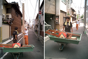 京都の優れた景観を未来に引き継ぐために今月スタートする「新景観政策」についてのKBS京都の番組です。京町家の保存・再生に取り組んでいる一つの活動として、僕らの大宮町家が取り上げられたのです。 K棟梁がまず、よしやまちでインタビューを・・・ 僕らは一足先に、大宮町家に行って作業を開始・・・ 大家さんのおばあちゃんに、インタビューがあるらしいですよ♪とお伝えすると緊張し始められた様子!?実はJもインタビューあると聞いてて緊張してたらしいですよ・・・(><) 暑い中、床板を外す作業をしながら、撮影スタッフを待つ・・・撮影開始を待つ・・・ 撮影スタッフが来られて、町家の前にも近所の方々「何だ、何だ」と集まり出す・・・ 撮影開始! まずは、大家さんのおばあちゃんのインタビュー♪ S先生&町子&J&IW&TSU、後ろで作業してるふり・・・IS、デジカメラマン! おばあちゃん、ナイスコメント!「やりますな~。おばあちゃん!」って思ってました。 次はJ! K棟梁とのからみ・・・K棟梁に指導を受けながら作業するJを撮る。K棟梁が何か言っている。聞こえているが撮られているからか頭に入ってこないJ・・・何を言ってらっしゃるんだ・・・J、ひたすら穴を掘る・・・ただ、ひたすら・・・たまぁにスケールで何かを計ってみる・・・ Jのインタビュー・・・自分が何を言ってるのか分からないJ・・・自分が何を言ったか覚えていないJ・・・ たぁだ!!!!!!「・・・町家は日本の宝だから・・・」っていうのは言ったった!!!!何処かで言ってやろうと思ってたからね♪自分で笑いそうになりながらも言ったったよ!!!!使われたらいいけど・・・ あとは、かけつけてくれたTOも加わり、床板をはがしている作業を撮影。シティボーイTOはタンクトップ! 町家の中などの映像など。。。かな。 インタビューや映像など、長い時間色々撮られてましたね。まあ、どれだけカットされ、どれだけ放送されるか、分かりませんが・・・どんなふうになっているのでしょう。放送、楽しみですね♪けど、インタビューした人は恥ずかしいですよね・・・おばあちゃん、K棟梁(><)♪ 9月2日に放送らしいです。みなさん、見てくださいませ!! 決して、Jについて笑わないように!!!特にS先生!!!! 大宮町家さんの最初の?晴れの舞台!! 大宮町家の存在が、集まられた近所の方々にも再認識されていいことだ。。。よいよい。 また、番組を見られた方にも何か伝わればよいですがな。。。 大宮町家があったらこそ、こんなみんなで何かできる機会が出来た。。。また楽しげなことができた。。。良い思い出?ができた。。。町家に感謝。みなさまに感謝。 みなさま、お疲れさまでしたm(--)m 大宮町家もお疲れさまでしたm(--)m これからも頑張って、大宮町家を良いものに!楽しいものに!していきましょう♪♪♪ よろしくお願い致します!!! 文章、長くなってしまった。。。 大家さんおばあちゃん&大家さん奥さん&S先生&K棟梁&町子&J&TSU&IW&IS&TO&KBS京都スタッフ 2007/08/22(Wed) 02:11:40