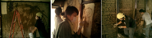 予定が少し狂ったこともあり、今日のメンバーは・・・・・・・・・・・・・・4人(><)町子&J&Y&N! よしやまち校舎に10時集合・・・Nさん来ないな・・・ しゃ~ない!行こう!Jは4mの足場板を担ぎ、Yは脚立や道具を一輪車へ積み、町子はYをサポートし・・・ こんな光景、昔はよく見られたんかな~。良い光景やないか・・・すがすがしい!!!!!? 大宮へ着き、まずは昨日雨で出来なかった石並べの続き。セメント固め!Nさんも来て、ちゃちゃっっと終わらせ、今日の目的、土壁を!!S先生が見に来られて、指導を受け、S先生奥様にいただいたアイスを食べ・・・ エネルギー補充。 さ~て・・・タオルをかぶり、マスクをして、完全防備や!!よし、みんなやるで~♪ 壁の下にゴザ・ブルーシートを敷き、作業しやすいように足場を組み・・・ひたすら壁を叩いて土壁を落としていきます。ホコリがすんげ~(><)室内がもう霧や、霧!!途中、お出かけついでに見に来られた大家さんの奥様も逃げるようにチャリでお出かけ!!!!!! なんか楽しいや~ん♪町子さんは町子印なんか壁に書いちゃって~♪ なんや~、らくしょ~や~ん♪Nさん、もう顔真っ黒や~ん♪きゃはは~♪♪♪ ・・・ ちょっと待て・・・ なんやこの土の量は・・・・ おい・・・果てしにゃぁぞ・・・・ 恐れすら感じるぞ・・・・ おい・・・終わる気がせんぞ・・・・・ 今日のノルマの半分ぐらいを崩し、途方に暮れる4人・・・ 町子さん、なんか朝より老けたんじゃない・・・??? ここから果てしない土壁との本当の戦いの始まりや・・・ ひたすら壁を崩すY&N・・・ひたすら土をガラ袋に詰める町子&J・・・ もうJは意識が朦朧とするわ・・・ふらふらや・・・ 何度も声を出し、自分に気合を入れる・・・ 何度も何度もガラ袋に土を・・・ 何度も何度も・・・シャベルで・・・しゃべらず・・・黙々と・・・モクモクと・・・ほこりが・・・ 果てしない・・・これは夢か・・・意識もうろう・・・ほんとに気力で動いてた感じや・・・ ・・・ っていうか、やっぱり町子さん老けたんぢゃな~~~い・・・??? ほこりで頭が真っ白・・・・町子おばあちゃん・・・ めっちゃ疲れた死にそうな顔・・・町子おばあちゃん・・・ ガラ袋の上で眠る・・・町子おばあちゃん・・・ うん!町子さん、めっちゃ頑張ってたよ!!!そりゃ、老けるよ・・・ ・・・ にしても、Nさんはすげーわー。。。よく働きなさる・・・感心する・・・いつも感心する・・・ Yも今までのブランクを取り戻すかのように働く・・・感心する・・・彼はやる子や・・・ 俺もがんばらなきゃ!ってなる・・・ けど、何度も座り込み、休憩して、みんなを眺めるJ・・・休憩回数NO.1・・・俺もおじいちゃん・・・ 『明日テストよ!Y君・・・こりゃ今日はもうテスト勉強なんて出来んね・・・ははは・・・』 土壁を落とした壁は、竹を編んだコマイが露わに・・・細い竹を編んであるんだけど、なんか・・・何故か、迫力があった・・・なんだろか、あの迫力は・・・歴史を感じるというか・・・町家の存在感を感じるというか・・・きれいだった。素晴らしい!!! いや~、今日の4人はホントに頑張った!!!ようやったわ!!! 今日は、みんなでみんなを誉めたいね!!!よく挫けずに頑張った!!! この日は作業後、銭湯に行き、疲れを癒し・・・言葉は△、心は□♪♪♪ その後、J&Yはめっちゃ疲れているはずなのに、なんでだろ、朝4時まで2人で勉強とトークと話しと笑い話と妄想とを頑張ったとさ・・・今日の作業をやりきった達成感からの興奮状態で、勉強も頑張れたんやろな・・・ ものすごくお疲れさまでした!!! めっっっちゃ大変やったけど、なんだか記憶に残りそうな充実した良い一日やった・・・ ありがとう!!! まだまだ、これからもあるで~♪ まだまだ、これからもやるで~♪ がんばりましょう!!!!!!!! PR 2007/09/11(Tue) 00:40:30